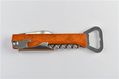 Wine Cork Screw Tool includes the following 4 tools: Knife, Corkscrew, Bottle Opener on the end of the tool and Fold Out Bottle Opener. Tools are all stainless steel.